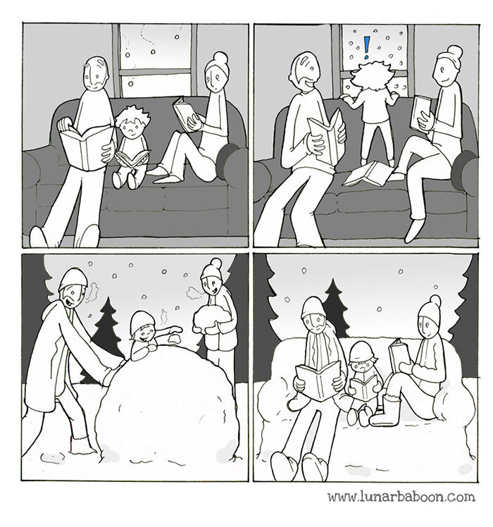 Праздничная неделя уже закончилась, но дух зимнего веселья все еще витает где-то в воздухе, так что я решил, почему бы мне не собрать еще одну атмосферную подборку, связанную с зимой. На этот раз речь пойдет о всяческих забавах, которые становятся доступны нам с появлением на улицах снега. К примеру, игры в снежки, лепка снеговиков, катание на санках и все в таком роде. Авторы в сегодняшней подборке будут самые разные - как российские, так и зарубежные: все-таки поиграть со снегом любят во всех странах, где он выпадает. Канадский художник Кристофер Грейди (Christopher Grady), также известный под псевдонимом Lunarbaboon, стал популярен в сети благодаря своим милым и жизненным комиксам о семейной жизни. В своих работах этот автор запечатлевает повседневные моменты и забавные ситуации, происходящие с ним самим, а также его женой и сыном. Конечно же, порою слегка приукрашивая или дополняя происходящее. Раз уж прошлый комикс уже начал тему снеговиков, закину в подборку и еще одну зарисовку