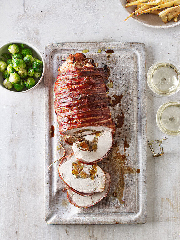 - Положите грудку индейки на чистую разделочную доску кожей вниз и равномерно распределите по ней начинку. Плотно сверните грудку длинной стороной к себе, а затем положите на доску изнаночной стороной вниз. Разложите полосатый бекон по всей длине индейки.