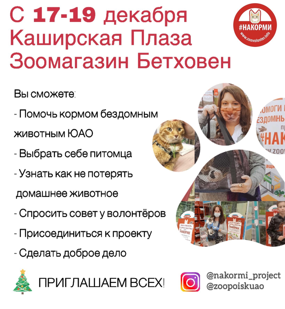 Друзья, приглашаем вас в Каширскую плазу с 17-19 декабря! Волонтёры проекта #Накорми будут ждать вас#Накорми азине Бетховен на первом этаже. Там вы сможете помочь кормом тем животным, которые ещё на улицах нашего округа. Напомню, что проект Зоомониторинг насчитал около 18.000 бездомных кошек в ЮАО. Кого-то потеряли, кого-то выбросили, а кто то живет уже поколениями, но всем им очень нужна еда, чтобы выжить, особенно в морозы! Собак в округе подкармливают на стоянках, в гаражах и на территориях промзон. В зоомагазине вы сможете больше узнать о проекте #Накорми, присоединиться#Накорми, и спросить советы по уходу и безопасности питомца. 😻На благотворительной акции вас будут ждать КОТИКИ, которые ищут дом😻 #zoopoiskuao С адресами#zoopoiskuao оробов для сбора Корма в ЮАО можно ознакомиться на карте https://zoovolonter.info По потеряшкам ЮАО Москва- ЗоопоискЮАО