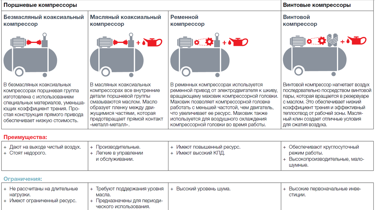 Выбор типа компрессора По технологии сжатия воздуха наиболее популярные компрессоры - поршневые и винтовые. Поршневые компрессоры выбирают, если потребность в воздухе небольшая и периодическая, а также требуется мобильность подачи воздуха (стройка, улица). Винтовые компрессоры незаменимы для интенсивной работы. Расчет производительности компрессора В паспорте компрессора обычно указывается производительность на входе. Это значение нужно умножить на КПД. Для поршневых коаксиальных компрессоров КПД 0,55. Для поршневых ременных компрессоров КПД 0,75. Для винтовых компрессоров КПД 0,95. Производительность компрессора = Паспортная производительность на входе * КПД. Определите, какой из планируемых к подключению пневмоинструментов имеет максимальную производительность (указана в паспорте изделия). К значению максимальной паспортной производительности нужно прибавить 20% необходимого запаса. Производительность компрессора должна быть больше, чем производительность пневмоинструмента.