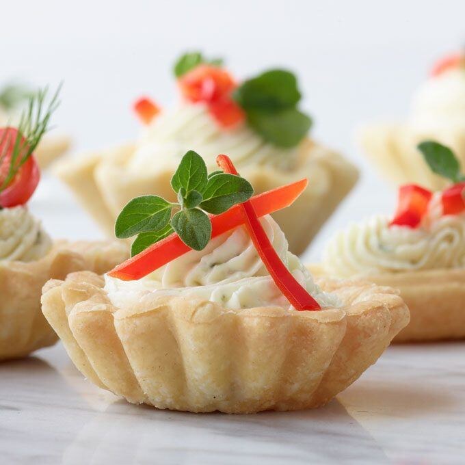 - Куриное филе обжарить с луком, добавить мелко нарезанные шампиньоны. Добавить сметану, мелко нарезанный укроп и тёртый сыр. Выложить в тарталетки, запекать 15 минут в разогретой духовке.