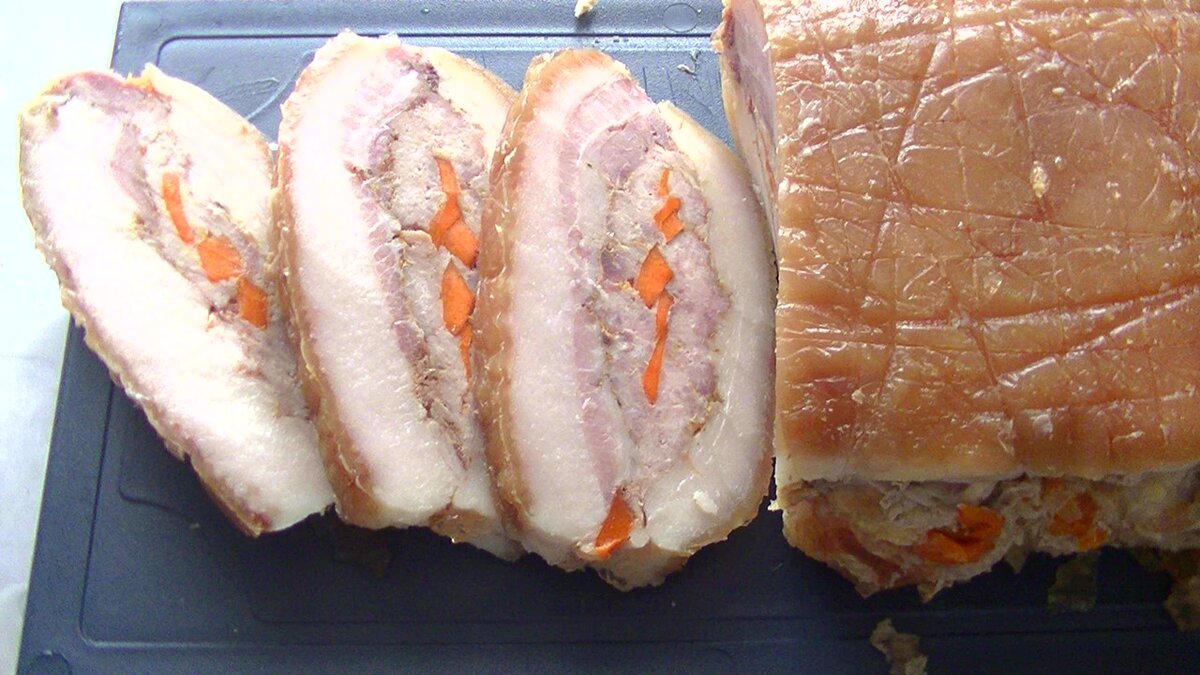 Очень вкусный, необычный, а главное дешёвый рулет из самых простых ингредиентов. Делюсь с вами рецептом, который удивил всех моих близких и друзей. Никто и не подозревал, что из самого тонкого сала можно приготовить такую вкуснятину, которую можно подать, как на праздник, так и на ужин или обед. КАК ГОТОВИТЬ: Берём самое тонкое сало 2 куска , делаем неглубокие надрезы, посыпаем солью и приправой для моркови по корейски и втираем в сало. Затем сверху распределяем чеснок натёртый на мелкой тёрке. Затем на оба куска выкладываем любой фарш по вашему вкусу посоленный и поперчённый. Далее на одну половину кладём свежую морковь. Затем вторую половину кладём на первую фаршем вниз и обматываем капроновой ниткой. Убираем в пакет для запекания и крепко обматываем ниткой, чтобы не попала вода. Кладём в кастрюлю с водой и варим после закипания 2 часа периодически помешивая. Через 2 часа ставим под гнёт на ночь. На следующий день убираем все нитки, и деликатес за копейки готов. Ингредиенты: тон