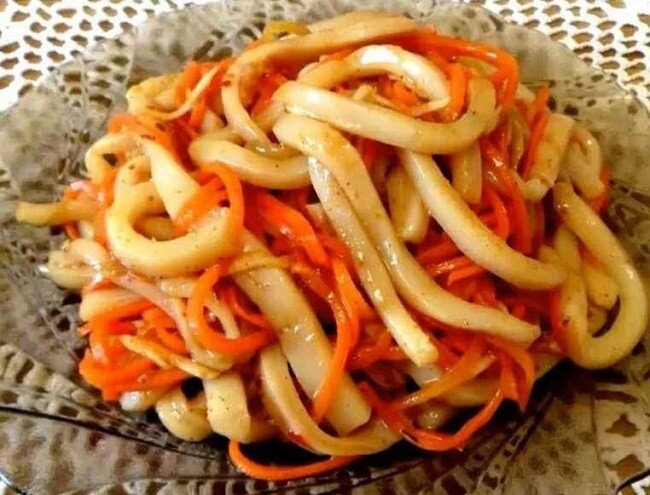 Здравствуйте, уважаемые читатели моего канала. Приближается Новый год, я уже 345 тысяч раз скорректировала новогоднее меню праздничного стола. Слишком много капризов у современных мужчин. Они вроде бы и традиционные блюда хотят, так как "куда ж без Оливьехи и Шубы?", но и в то же время присытилось им каждый год одно и то же, чего-то "необычного хочется, экзотики". После этих слов мы с моей подругой хотели вообще отказаться праздновать Новый год с мужьями, но так просто отвязаться не получилось. В общем, заморочилась я с поиском рецептов, чтоб и вкусно и не трудозатратно, ну и экзотично немного. Хочу сегодня рассказать вам про один супер рецепт. Закуска получается очень вкусная, не избито, новый вкус, да и готовить проще простого. Думаю, привереды будут довольны. Итак, сегодня и на Новый год готовим "Кальмаров по-корейски", что же нам понадобится? Ингредиенты: ⠀ очищенные тушки кальмаров - 1 кг. морковь - 2 или 3 шт. масло растительное - 2-3 ст. л. лук репчатый - 1 шт. чеснок - 2-3 з
