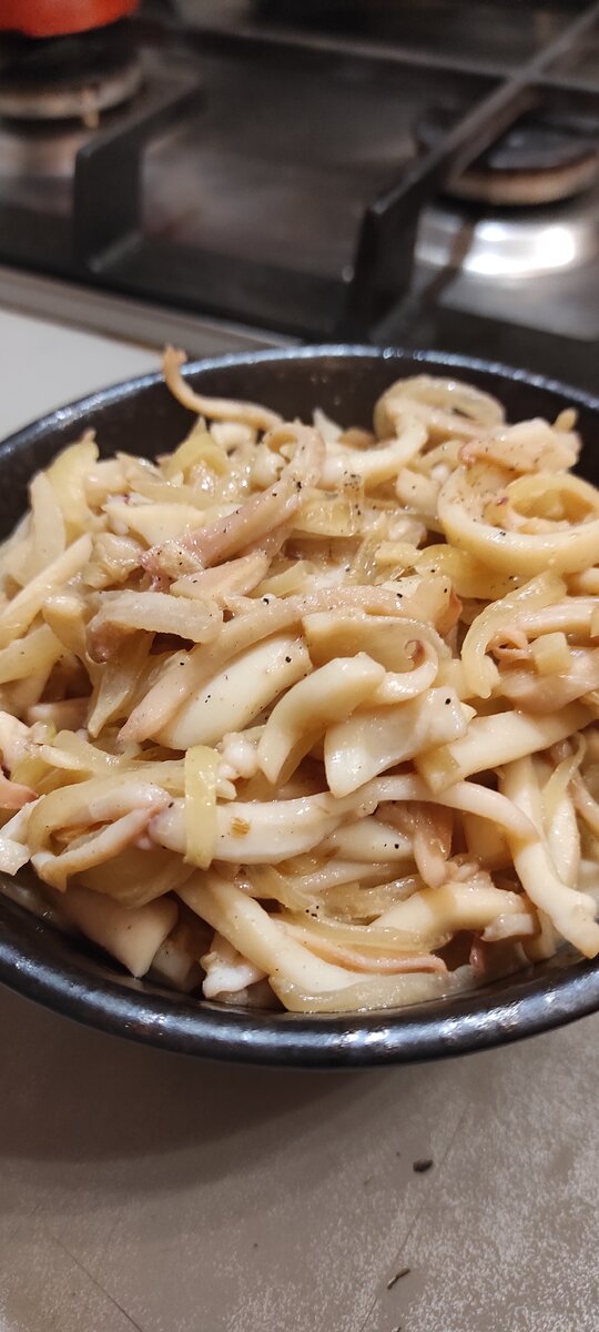 Кальмар полезен тем, что: Ингредиенты: -кальмары сырые-500 гр -лук репчатый-2 шт -чеснок-3 зубчика -масло сливочное-1 ст. л -масло растительное-1 ст. л -майонез-2 ст. л -сметана-2 ст. л -соль, перец Для украшения можно использовать зёрна граната👍👍 Приготовление: 1. Кальмары очищаем и режем соломкой. 2. Лук режем перьями, чеснок измельчаем. 3. На сковороде разогреваем смесь из сливочного и растительного масла. Обжариваем лук и чеснок. 4. Добавляем кальмары и быстро обжариваем всё вместе, минуты 2, добавляем соль, перец, сметану и майонез. Держим ещё пару минут и выключаем, чтобы кальмары не пережарились. 5. Выкладываем в салатник. Рекомендую попробовать добавить зёрна граната, они дадут кислинку. Салат готовится очень быстро и он очень вкусный! Приятного аппетита!
