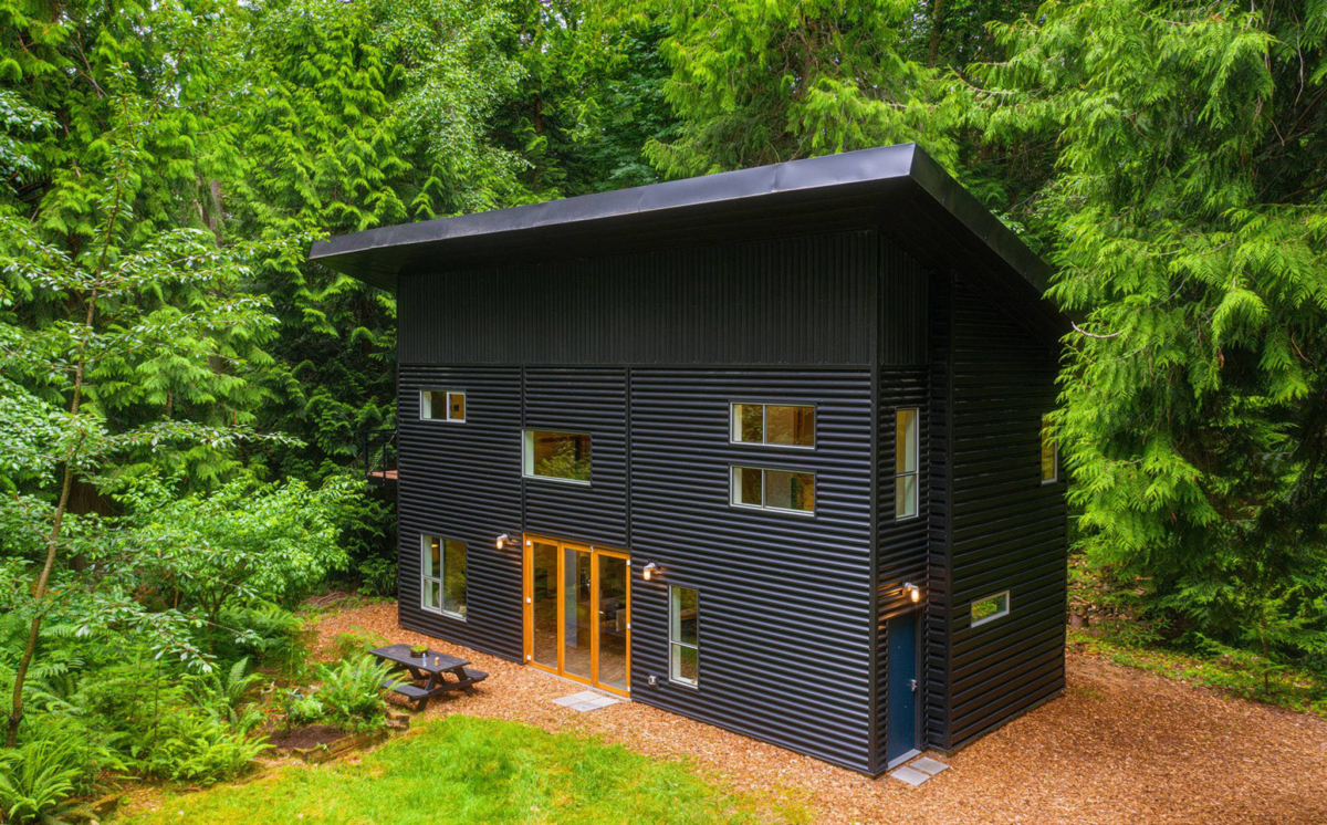 Прожив три года в съемной квартире, супруги Эрик и Венди решили, что пора обзавестись собственным домом. Бюджет пары был ограничен, поэтому они потратили еще несколько лет на поиск подходящего недорогого участка. Главным условием было тихое, уединенное место. На такие критерии, как красивый вид на озеро или близость к океану, они и вовсе не обращали внимание — для них это было уже роскошью. В результате супруги нашли то, что искали: небольшой участок, расположенный на опушке леса, в окружении хвойных деревьев. Проектирование дома они доверили своему другу — Каре Пискителло. Эрик и Венди тоже принимали активное участие в создании жилища. Вместе с архитектором они придумали как построить простой, но современный и комфортный дом, который не требовал бы существенных затрат на обслуживание. Площадь дома — всего 110 м². Открытая планировка создает ощущение плавного перетекания одного помещения в другое, а благодаря высоким потолкам, комнаты, да и весь дом в целом, кажутся намного больше, чем