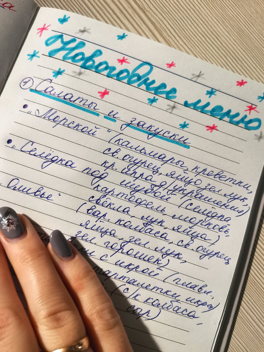 Здравствуйте, мои подписчики и гости! 🤗 Время идёт, приближается самый волшебный зимний праздник, а я ещё не в зуб ногой! 😂 Решила начать с составления новогоднего меню, чтобы знать, что конкретно покупать. Обещаю, пойду в магазин со списком! Иначе, скуплю всё, что надо и не надо 😅 В новогоднюю ночь мы с мужем, скорее всего, останемся вдвоём. Старший сын Егор собирается отмечать праздник с родным папой (я не запрещаю и не заставляю, хочет - ради Бога, 1 января придёт к нам), а маленькая Настюша с нами, но она будет спать 😴☺️ А много ли нам надо двоим с мужем?) Каждый год собираюсь приготовить всего по минимуму. Только шампанское, бутерброды с икрой, колбаска, фрукты, конфеты. Но нет же, я привыкла готовить на всю Маланьину свадьбу! По-другому уже рука не берёт 😂 Возможно, я покажусь старомодной, может быть это в силу профессии учителя, но прежде чем что-то решить и утвердить, я должна это увидеть на листе бумаги, написанное собственной рукой. Не напечатанный текст, а именно напис