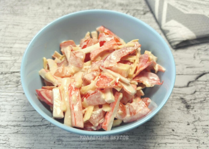Фантастически вкусный КРАБОВЫЙ САЛАТ — со стола "улетает" одним из первых! Рада приветствовать вас на канале "Коллекция вкусов", где вы всегда найдёте множество простых и вкусных рецептов на каждый день. ✨ Существует огромное множество рецептов салатов с крабовыми палочками, и наверняка у каждой хозяюшки есть свой любимый и удачный вариант салата с этим ингредиентом. ✅ Сегодня делюсь своим любимым рецептом салата с крабовыми палочками, который обязательно будет на нашем новогоднем столе — у гостей он пользуется огромным спросом и со стола (без преувеличения) исчезает одним из первых! 🥗 Ингредиенты: - крабовые палочки — 250 гр.; - помидоры — 2-3 шт.; - перец болгарский — 1 шт.; - твёрдый сыр — 100 гр.; - чеснок — 2 зубчика.; - соль, майонез— по вкусу. ✔️ Приготовление: Болгарский перец нарезаю соломкой. Соломкой же нарезаю и крабовые палочки, помидоры нарезаю кубиками. Твёрдый сыр натираю на крупной тёрке. Все ингредиенты собираю в салатнике, добавляю измельчённый чеснок. Запр