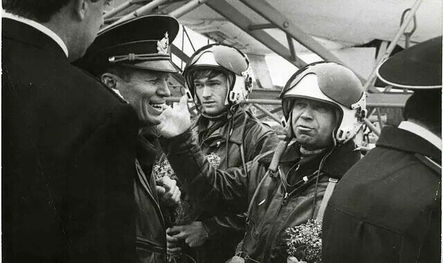 На фото - поздравляю экипаж полковника Н.И.Пелипенко с успешным пуском АКР, стоят в ЗШ: штурман Виктор Чибиков, и правый лётчик Лёша Дюпин.
