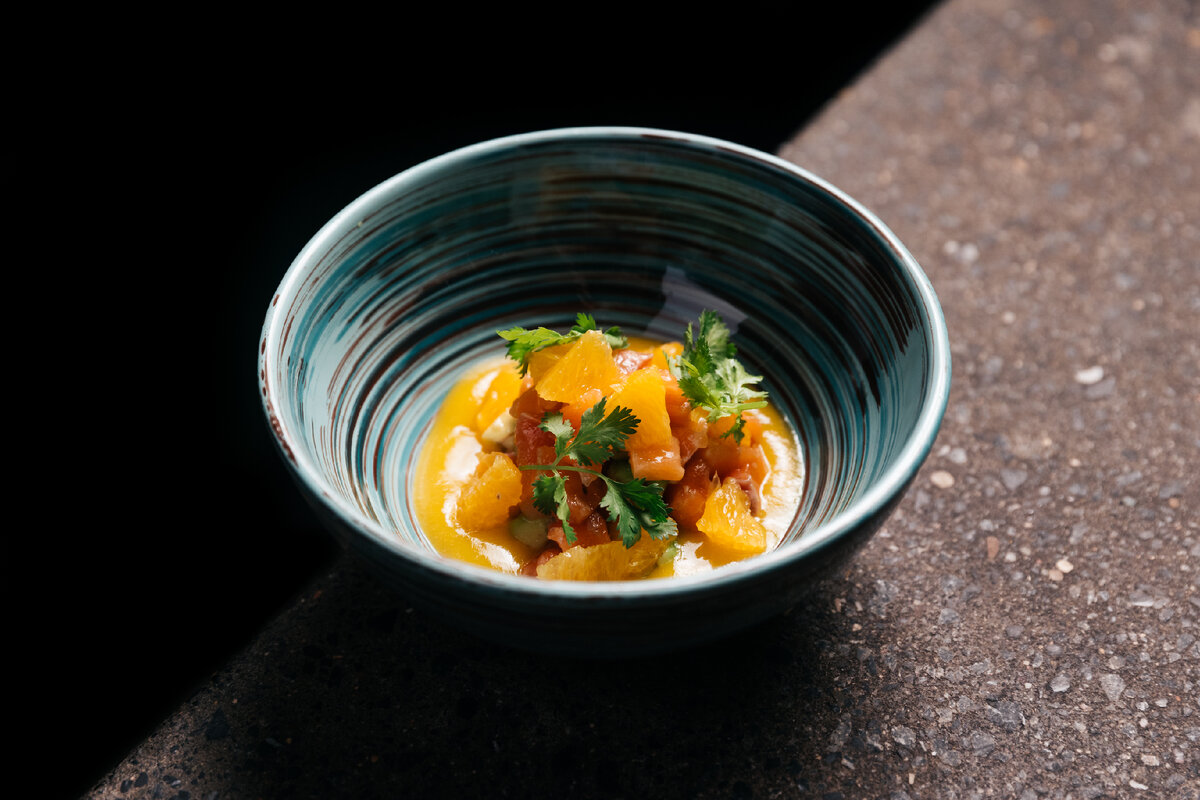- На дно тарелки выкладываем соус из манго. На него выкладываем лосось и авокадо горкой. В произвольном порядке выкладываем сегменты апельсина. Украшаем кинзой.