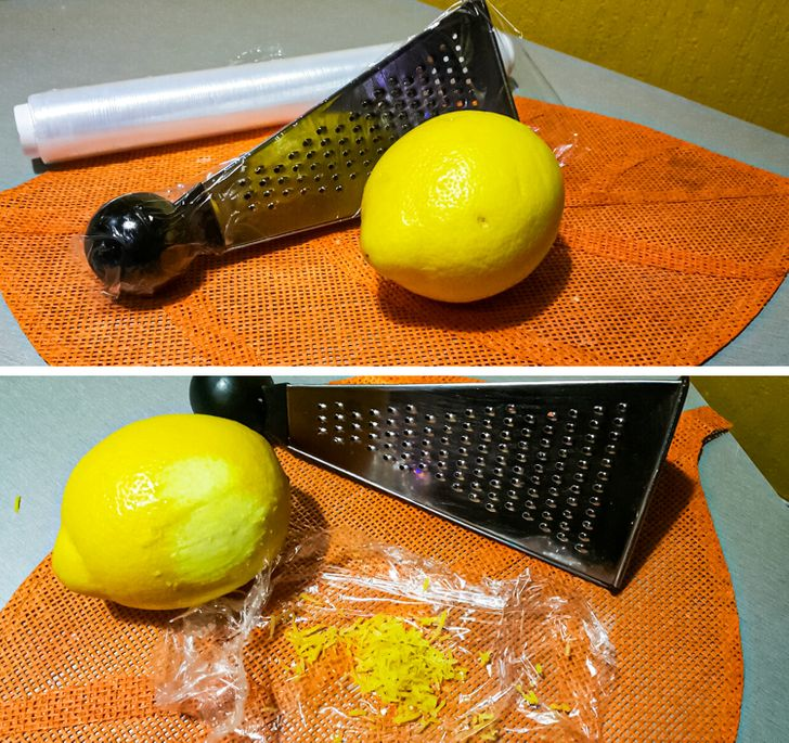 1. Чтобы не выковыривать цедру цитрусовых из мелкой терки, положите на нее сверху пищевую пленку и только после этого начинайте тереть. Когда закончите, просто снимите пленку и счистите с нее остатки цедры. Также эту хитрость можно использовать тогда, когда нужно измельчить сыр. 2. Защита фруктовых нарезок.