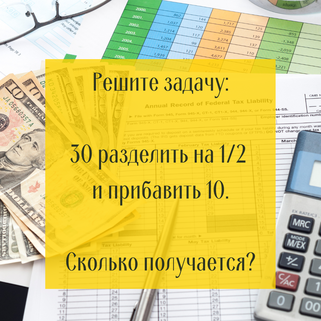 Проверьте, получится ли у Вас! Решите задачу: 30 разделить на 1/2 и прибавить 10. Сколько получается? Варианты ответа: 25, 70, 45. Первый ответ, который многим приходит на ум: 25. Ход решения они видят такой: 30/2 + 10 = 25 Но это - ошибка. Если мы делим на дробь, её нужно переворачивать и умножать: 30*2 + 10 ... И правильный ответ это - 70!