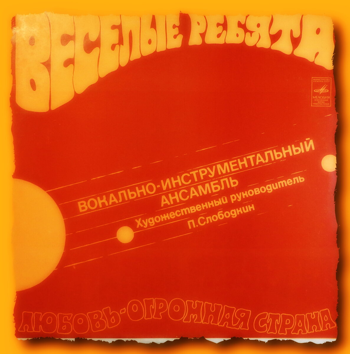 «Любовь - огромная страна» - первый диск - гигант ансамбля «Весёлые ребята», выпущенный фирмой «Мелодия» в 1974 году, то есть 47 (!!!) лет назад. Но большинство этих песен не только не забыто, но и популярно до сих пор. Пластинка переиздавалась 29 раз и её общие тиражи таковы, что по зарубежным стандартам альбом наверняка считается платиновым и, возможно, не единожды. В 2009-м году, компанией Bomba Music, альбом был переиздан и на компакт-диске. Вариантов оформления лицевой стороны конверта пластинки было два, но отличия лишь в цветовой гамме. Нет глобальных отличий и в обоих вариантах оформления обратной стороны конверта. Лишь фотографии музыкантов и текстовая информация расположены по-разному. Рискну предположить что данный альбом - лучший в дискографии коллектива. Во всяком случае по моему мнению. Так часто бывает что именно первые альбомы оказываются самыми сильными, а все последующие, иногда совсем чуть-чуть, но не дотягивают до изначально заданной планки. Впрочем, чтобы понять э