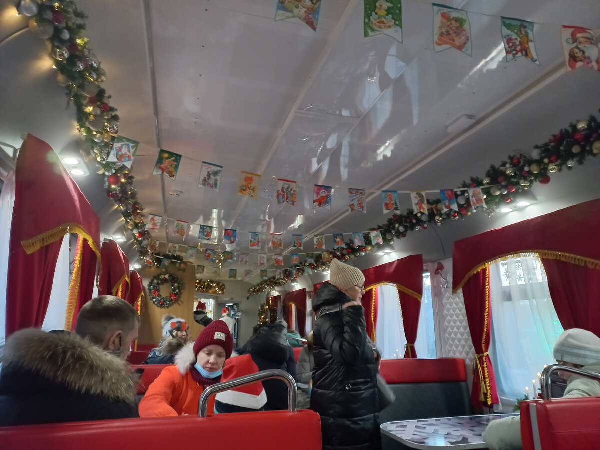 В составе поезда были несколько вагонов, куда можно было заглянуть, например, в вагон-ресторан, в красивом новогоднем оформлении.