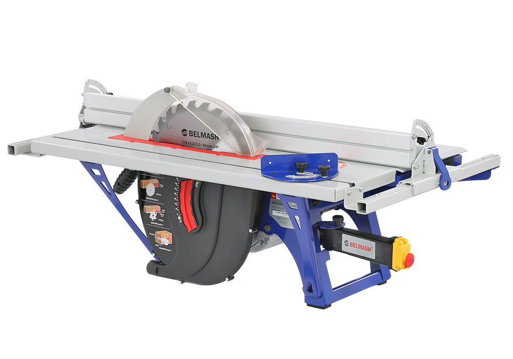 BELMASH SDM-2500M – самый мощный (2500 Вт) комбинированный станок из топовой серии SDM. Он рассчитан на выполнение всех основных операций: Пильный узел станка рассчитан на установку дисков диаметром 315 мм, что позволяет распускать заготовки до 117 мм высотой. Столы (пильный и строгальные) при этом образуют единую рабочую достаточно большую поверхность. Настройка высоты пропила происходит за счет изменения положения режущего инструмента. Кроме пильных дисков можно устанавливать дисковые фрезы диаметром 125 мм, шириной до 10 мм. Станок оснащен параллельным упором, который устанавливается на направляющие со шкалами. Его можно использовать как при пилении (с обоих сторон режущего инструмента), так и при строгании. Установка проста: на одной стороне упора находится зацеп, на второй – фиксатор. Направляющая упора выполнена из алюминиевого профиля. Ее можно установить под углом от 0 до 45°. Для точного позиционирования заготовки при распиловке станок имеет угловой упор. Он устанавливается в