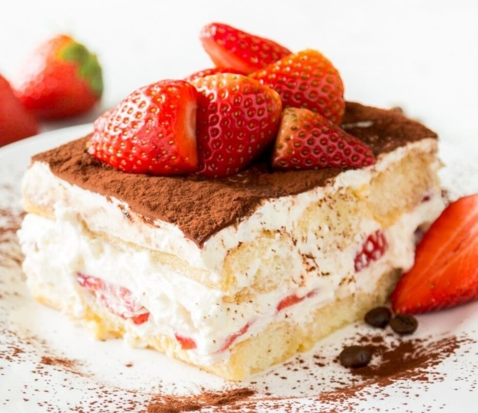 Тирамису - это популярный итальянский десерт, а нежнейшее сочетание кофейного и сливочного вкусов, вряд-ли оставит кого то равнодушным... Ингридиенты: Для начала хорошо взбиваем холодные сливки, по консистенции они должны быть как густая сметана, убираем в холодильник. Сыр маскарпоне смешиваем с сахарной пудрой. Соединяем со сливками. Затем нужно сварить кофе и вылить в глубокую тарелку. Далее начинаем собирать десерт. Печенье обмакиваем в кофе и выкладываем первый слой. На печенье намазываем сырно-сливочную массу, клубнику разрезаем пополам и выкладываем следующим слоем. Далее повторяем слои. Готовый десерт убираем в холодильник на 40 минут. Перед подачей посыпаем какао и украшаем оставшейся клубникой. Приятного аппетита!
