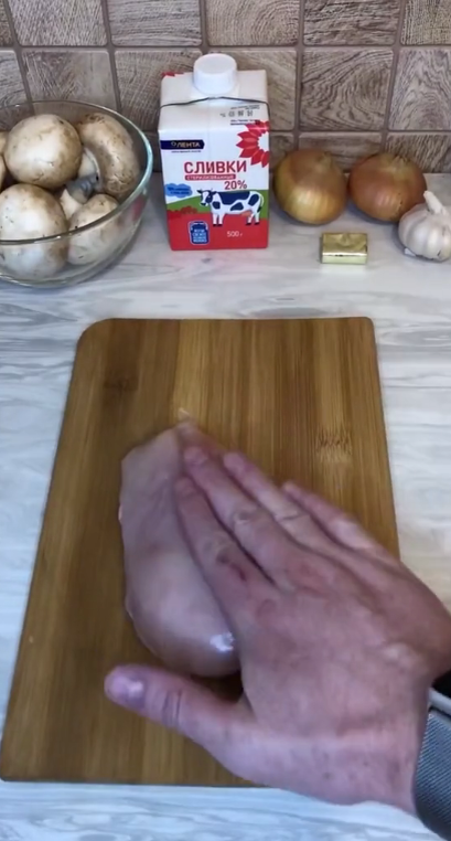 Далее откладываем на тарелку мясо и нарезаем лук, чеснок мелко высыпаем нарезанное и добавляем Сливочное масло для сливочности вкуса далее нарезаем шампиньоны как показано на видео Как грибы ужарились высыпаем все гриби к луку с чесночком и добавляем ещё сливочного масла и готовим грибы на максимальном огне Добавляем