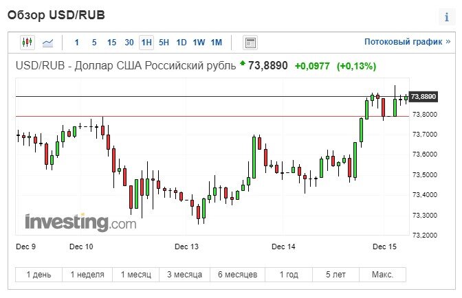 Только вчера я написал о том, что российский фондовый рынок продолжает снижаться на фоне отсутствия прояснений в геополитике, но курс рубля при этом очень странно, буквально чудом, вопреки всем экономическим законам, держится на месте. Как оказалось, чудо длилось совсем недолго, а точнее - менее суток. Уже вечером вчерашнего дня рубль тоже начал падать с каким-то непонятным опозданием. В общем, держался-держался и не удержался. Такое снижение в данной ситуации вполне закономерно, вот его отсутствие, как я уже писал, выглядело очень странно и даже подозрительно. Снижение курса рубля, которое должно было начаться немного ранее, началось сейчас. Пока его нельзя назвать сильным (курс доллар/рубль поднялся с 73,5 до 73,9, то есть, всего на 0,5%). Но, на мой взгляд, это еще только начало. Дело в том, что сегодня вечером состоится заседание ФРС США, на котором практически наверняка будут объявлены новые меры по ужесточению денежно-кредитной политики для борьбы с разогнавшейся еще сильнее инфл