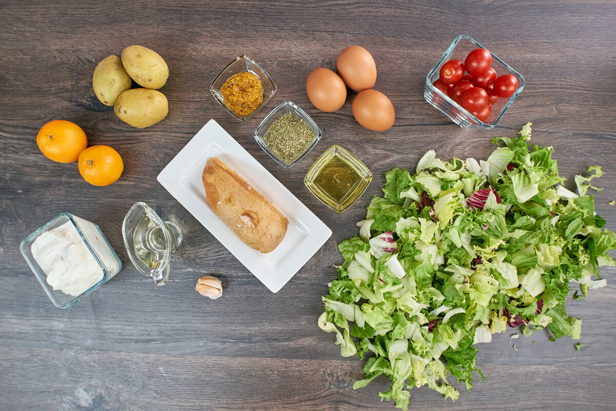 Сохраняй наикрутейший рецепт от Александра Бельковича! Ингредиенты Салатный микс (фриссе, романо и родиччо) 200 г Куриная грудка варёно – копчёная 220 г Картофель средний/мелкий 250 г Черри красные 200 г Мандарины 2 шт. Яйца 3 шт. Йогурт 140 г Зерновая горчица 1,5 ч. ложки Мёд жидкий 1 ч. ложка Чеснок 2 зубчика Прованские травы 1 ст. ложка Подсолнечное масло 20 мл Соль Перец Приготовление 1. Картофель среднего и мелкого размера хорошенько помыть, просушить, переложить на фольгу, посыпать прованскими травами, добавить 2 измельчённых зубчика чеснока, посолить и взбрызнуть 20 мл растительного масла. Хорошенько перемешать картофель в ингредиентах, завернуть в фольгу и отправить в разогретую до 200 градусов духовку на 40 минут. Готовый картофель развернуть, дать остыть и нарезать дольками. 2. Йогурт смешать с 1,5 ч. ложкой горчицы, 1 ч. ложкой мёда и перемешать. 3. У грудки снять кожу и нарезать грудку соломкой. 4. Заранее отваренные и очищенные яйца нарезать дольками. 5. Помидоры