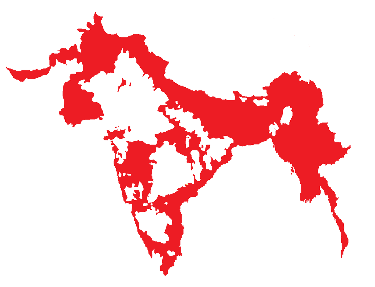 Я думаю, термин «Британская Индия» всем хорошо знаком. Большинство людей ассоциируют его с нынешним государством Индия, а также с ближайшими — Пакистаном, Бангладешем и Мьянмой (Бирмой). Это те страны, которые стали независимыми в 20 веке, а раньше были английскими колониями. Однако, тут всё не так просто. Дело в том, что Британская Индия выглядела именно так, как на красной карте выше. Эта страна странной формы существовала почти век — с 1857 по 1947 годы. Белые острова и островки — это так называемые туземные княжества, которые хоть и находились под протекторатом Британской Индии, но всё же не входили в её часть, были самостоятельными. Кстати, Бирма (сейчас Мьянма) выделилась в отдельную колонию ещё в 1937 году. Но была зависимой, конечно, от Британии. А вот в 1947 году Британская Индия прекратила существование и разделилась на нынешнюю Индию и Пакистан. Второй стал отдельной страной, потому что там живёт преимущественно мусульманское население («Пакистан» - значит «страна чистых»,