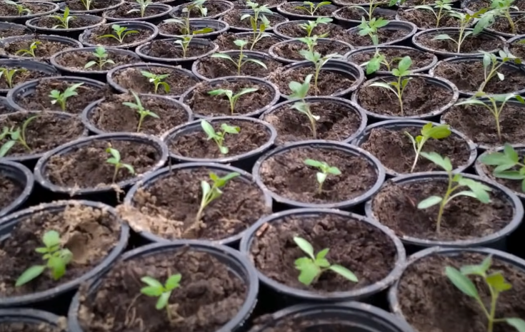 16 день со дня всходов нашей рассады. У наших томатов появился уже настоящий второй листок и сегодня мы примемся рассаживать рассаду в горшки. Горшки будут 0,5 л. Их мы уже засыпали грунтом. Грунт мы приготовили сами: мы взяли 4 ведра песка карьерного, смешали его с 1 ведром торфа и 1 ведром перегноя коровьего, перепревшего, сухого. Это всё мы хорошо смешали и насыпали в горшки. Горшки мы не трамбуем, чтобы почва оставалась у нас воздушной, воздухо и водопроницаемой, чтобы наши корешки без проблем пошли в эту землю и наши томаты успешно принялись.