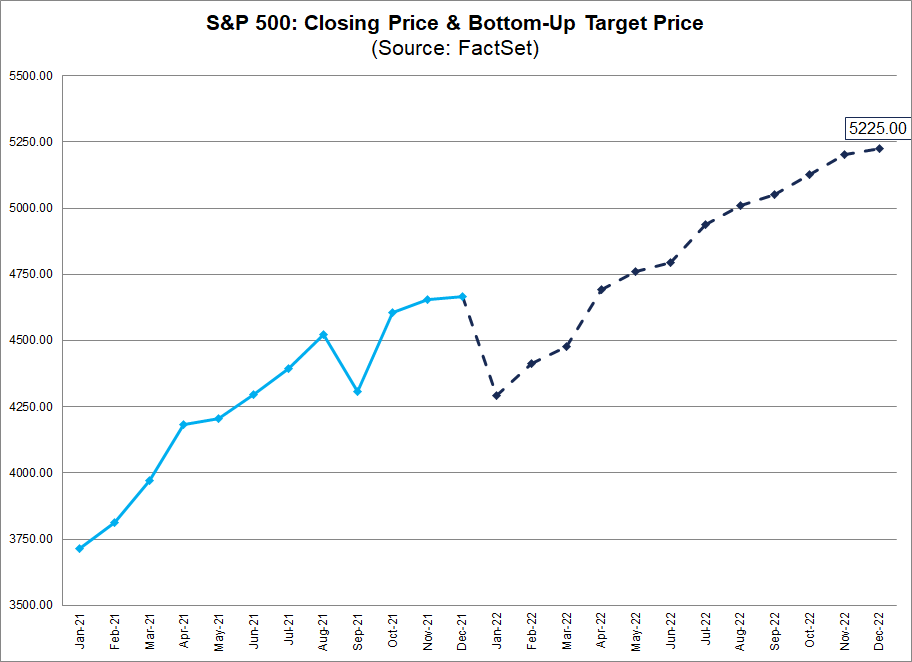 В декабре аналитики делают прогнозы относительно цены закрытия S&P 500 на следующий год. Ряд рыночных стратегов считают, что индекс закроется на уровне или выше 5000 к концу 2022 г. Отраслевые аналитики в совокупности прогнозируют, что цена закрытия S&P 500 через 12 месяцев составит 5 225,00. Эта восходящая целевая цена для индекса рассчитывается путем агрегирования средних оценок для всех компаний в индексе. 09.12 минимальная целевая цена для S&P 500 составила 5 225,00, что на 11,9% выше цены закрытия на 4667,45. На уровне секторов ожидается, что наибольший рост произойдёт в секторах услуг связи (+22,0%) и энергетики (+19,2%). С другой стороны, ожидается, что в секторе коммунальных услуг (+6,2%) будет наблюдаться наименьший рост. Важно отметить, что отраслевые аналитики исторически переоценивали цену закрытия индекса в начале года. В среднем они завышали конечную цену индекса примерно на 7,3% на один год вперед в течение предыдущих 15 лет. Однако это среднее значение в 7,3% включает