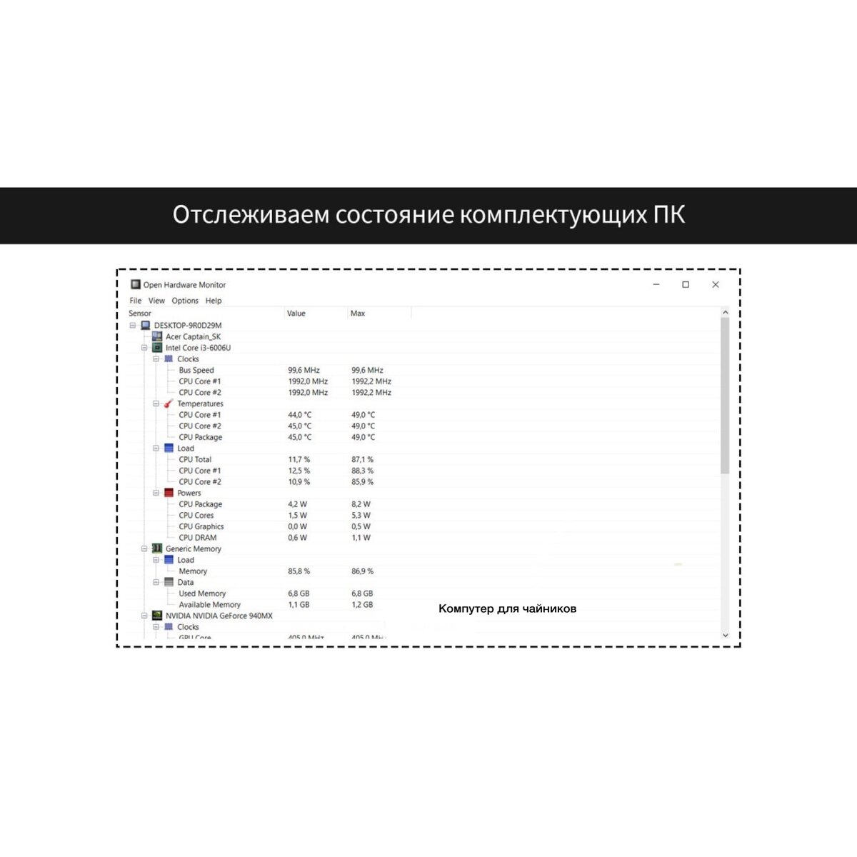 Иногда внезапная кончина какого-либо комплектующего может нанести катастрофический урон не только накопленным данным и рабочим материалам, но и организму пользователя, в частности — нервной системе. Open HardWare Monitor Программа, которая позволит исключить подобный форс-мажор. Она отслеживает по температуре, напряжению и количеством оборотов состояние процессора, памяти, дисковых накопителей, сетевых адаптеров. Если возникнет критическое изменение одного из параметров, то программа своевременно предупредит.