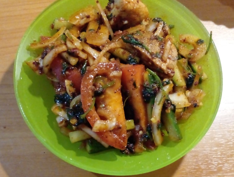 Ну вообще то это хе из куриных медальонов, но в этот раз он получился просто супер вкусным и красивым. Я купила в Перекрестке упаковку куриных медальонов, думала что там действительно красивые медальоны, но открыв упаковку разочаровалась , конечно же это были обычные порезанные куски филе и не очень красиво порезанные. Ну да ладно, думала я, думала и решила приготовить салат. Сначала не думала во что это превратиться, а потом как то само по себе получилось хе. Я сначала помыла и обсушила мясо, затем заправила мясо специями, а это соль,черный молотый перец, паприка хлопьями,молотые семена кинзы, всего понемногу и оставила на пару часов мариноваться. Ну а затем просто пожарила с двух сторон на масле. Почистила лук 1,5 головки, 1 большой розовый помидор и один большой огурец,еще можно было бы положить болгарского перца, но я его не очень люблю. Всё порезала на удобные кусочки и сложила в одну чашку(в галерее). Огурцы я освободила от сердцевины, чтобы салат не был слишком водянистым. Зате