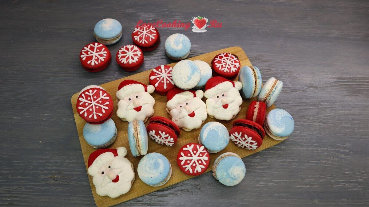 Отсаживаем макарон по углом 90°С на тефлоновый коврик. Именно на нём получаются самые идеальные макарон. Я делала печенье диаметром 3,5 см и в виде деда мороза. Оставляйте место между ними, учитывайте, что они немного растекутся.