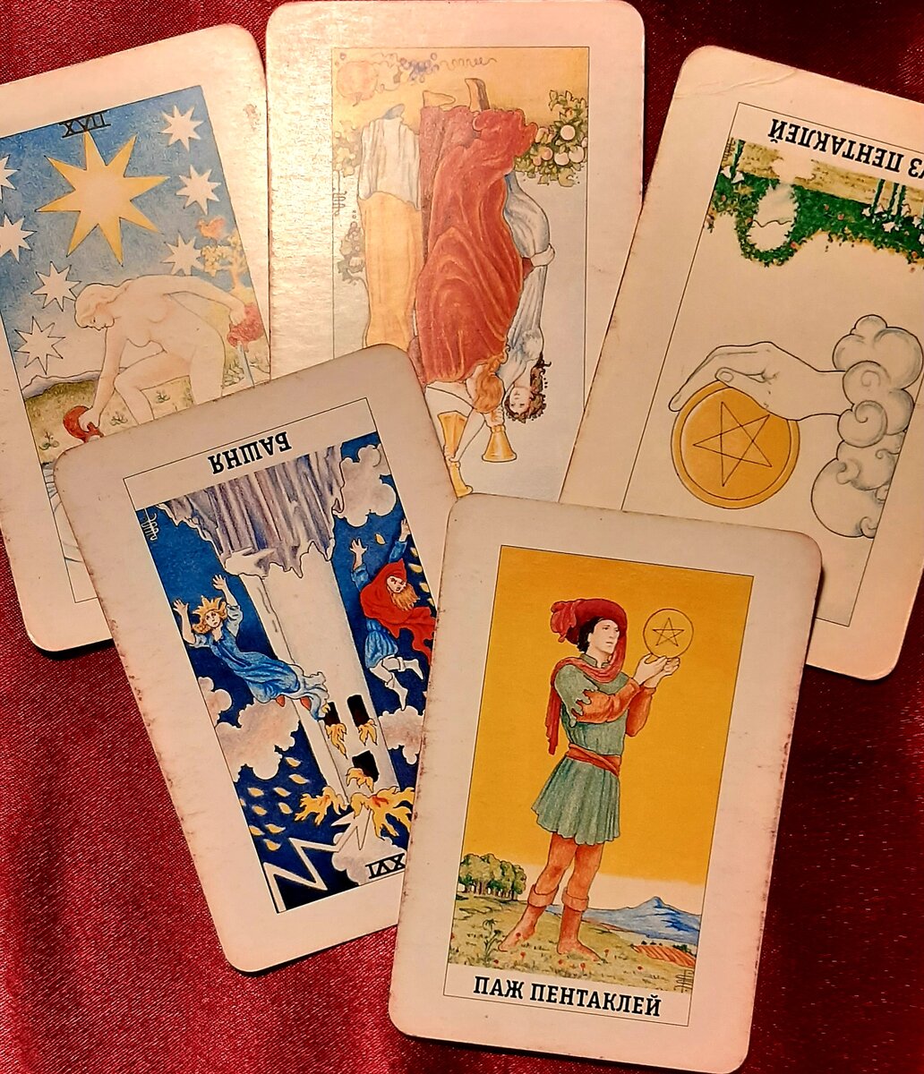 В первой позиции выпали карты Звезда, Тройка Кубков (перевёрнутая), Туз Пентаклей (перевёрнутый).