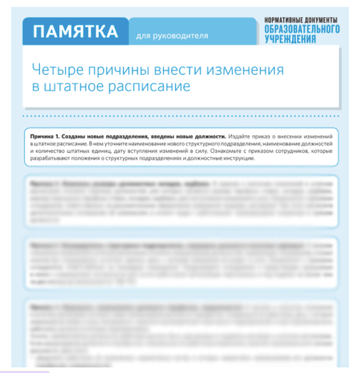 По закону штатное расписание необязательный документ. Трудовой кодекс требует составить правила внутреннего трудового распорядка, график отпусков, но не штатное расписание. Но при каждой проверке его требуют представить и налоговики, и трудовики. Они сверяют со штаткой выплаты работникам, считают среднюю зарплату, контролируют соблюдение МРОТ и т. д. Поручите вашему кадровику проинспектировать штатное расписание с учетом изменений законодательства. Для этого ему необходимо проверить некоторые элементы. Что еще изменить в штатном расписании – читайте в статье. Используйте памятку – четыре причины внести изменения в штатном расписание. Скачать памятку #образование #детский сад #штатное расписание