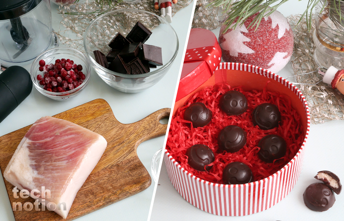 Специи можно добавлять по своему вкусу. Мне кажется, что сюда идеально подходит острый молотый перец. Он как бы соединяет вкус шоколада и сала и придает пикантности. Еще я добавила в каждую конфетку по ягодке брусники, потому что мне показалось, сюда нужна какая-то кислинка. Вы можете экспериментировать по своему вкусу.
