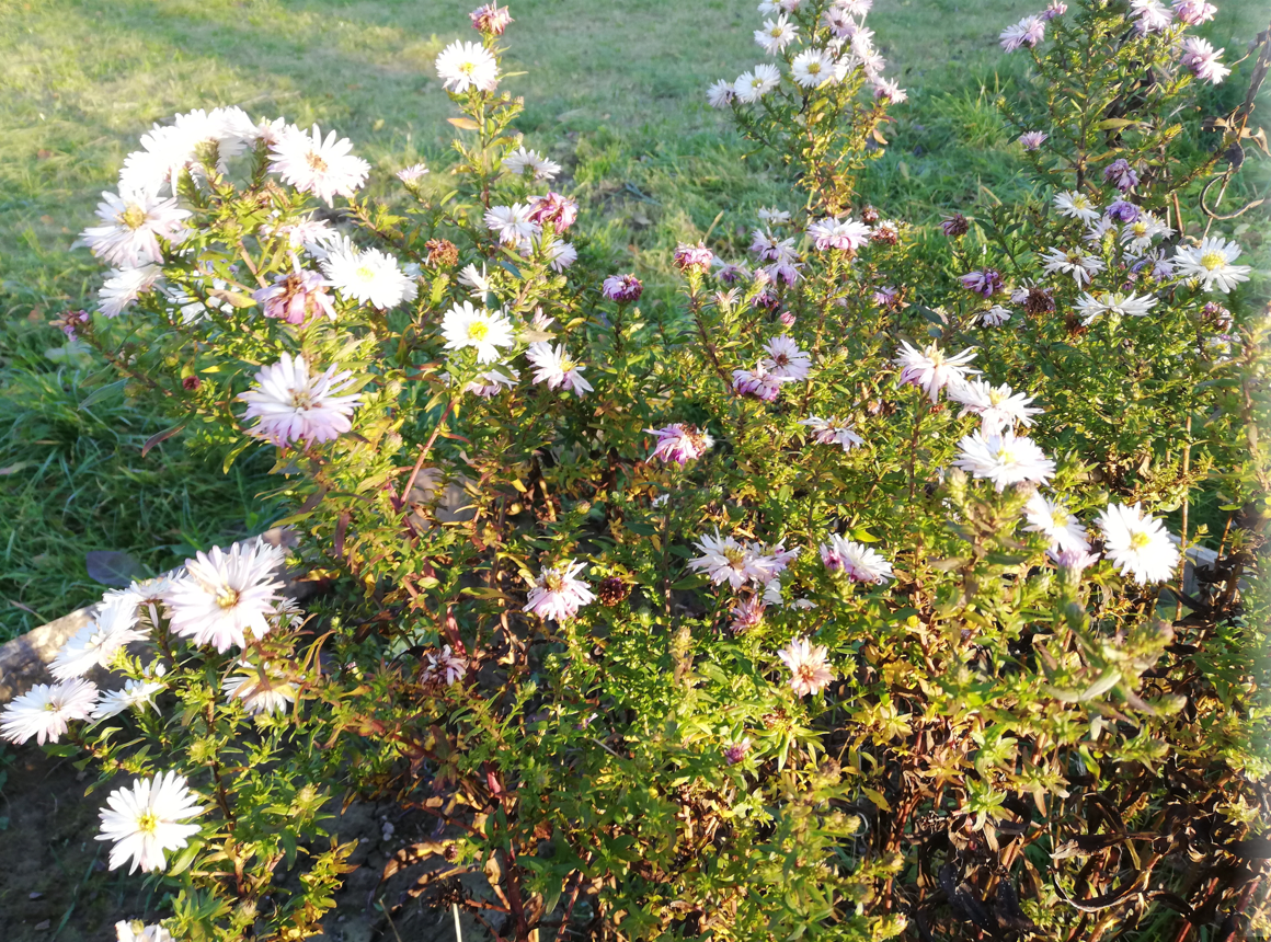 Я не так давно рассказывала историю о том, как лет 30 назад, на заре своего дачного бытия, купила фиолетовые хризантемы. Которые оказались не хризантемами. Да и фиолетовыми были недолго. На деле купленные мною цветы оказались октябринками или астрами новобельгийскими. За все эти годы я много раз пересаживала их с места на место - все надеялась, что они опять станут фиолетовыми. Да где там, только ободки у некоторых цветков, и то не всегда. Но вот интересный поворот случился с этими цветами в этом году. В середине ноября я увидела в палисаднике цветы. Они были точь-в-точь такие, какими были мои "хризантемы" в год покупки, только невысокие. Да, когда-то очень давно, лет десять назад, а то и больше, эти самые хризантемы росли в этом палисаднике. Так что можно было бы предположить, что где-то остался корешок, когда мы их выкапывали, чтобы пересадить. Только вот что интересно - за все эти годы я ни разу не видела здесь этих цветов. Хорошо, тут можно предположить, что в предыдущие годы они