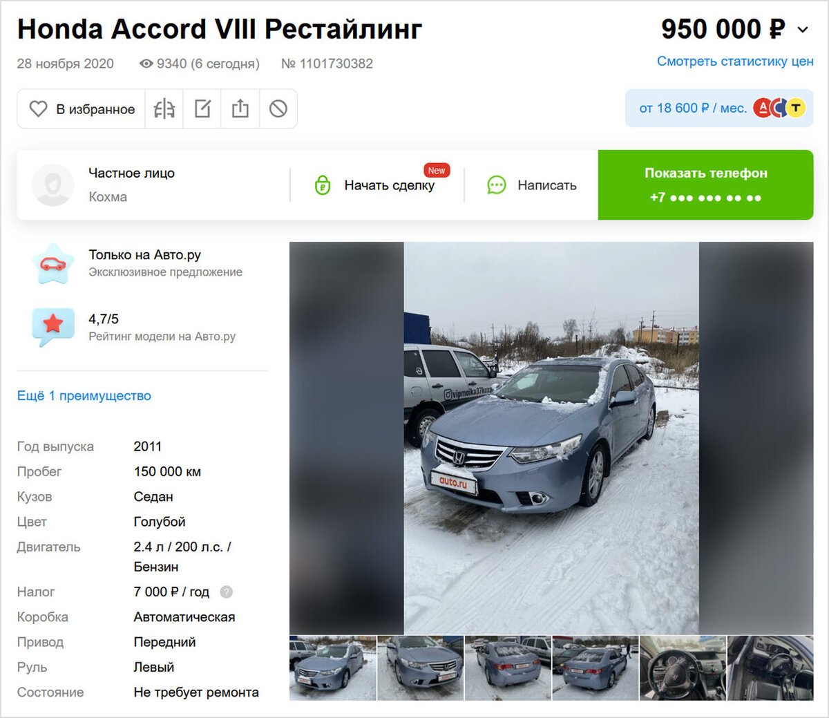 Компания Honda практически самоустранилась с российского рынка, но её модели до сих пор популярны на вторичке. Покупатели ценят их за продвинутую конструкцию (не в ущерб надёжности), экономичность и комфорт. А седан Accord, имеющий репутацию «японского BMW», — ещё и за отличные ходовые качества. Но сохранит ли их японский автомобиль после десятка лет, прожитых на российских дорогах? Особенно если о нём найдётся повод рассказать в нашей рубрике «Не бит, не крашен»... И про эту Honda Accord есть что рассказать. Несмотря на популярность модели, седан 2011 года очень давно продаётся на Авто.ру. И если год назад цена в 950 000 рублей ещё могла кому-то показаться завышенной, то сегодня она — одна из самых низких на рынке. Хотя пробег у машины не аномально большой для её возраста — 150 000 км. Комментарий продавца Хороший надежный автомобиль в отличном состояние. Все вопросы по телефону. Хорошему покупателю хороший торг Продавец ещё и готов торговаться, обещая сделать хорошую скидку «хорошему