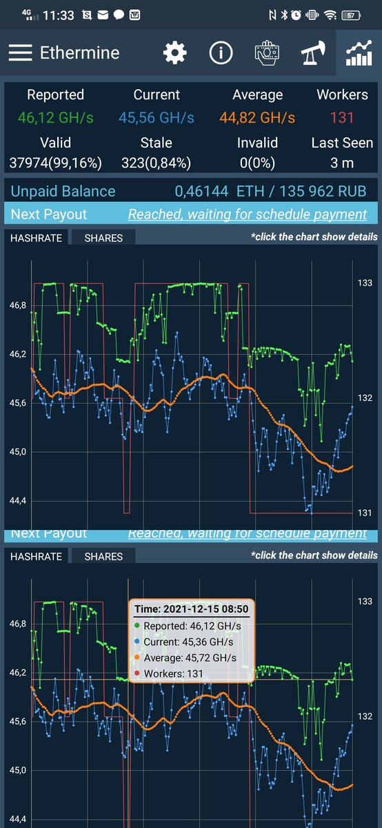 При подключению к пулу Хешрейт ваших воркеров будет плавно расти после начала работы с пулом, имейте терпение и не паникуйте. Учтите, что пул измеряет хешрейт на основании количества присланных вами ШАР. Это значение хешрейта может немного отличаться от данных в вашем майнере (Reported Hashrate). Если программа-майнер передает на пул значение этого хешрейта, то оно отображается в отдельной колонке выше, а также на графике хешрейта. Текущий хешрейт учитывает последние 30 минут работы, средний хешрейт — 1 час(ов). Статистика будет точной через сутки. График хэшрейта не ровный потому что удача меняется, много шар нашла ферма, график на высоте, ничего не нашла, график в низу. Это нормально. Ферма подсвечивается как неисправная, если она не присылает шары на пул в течение последних 30 минут. Проверьте ферму и выполните ping пула. Если ping не проходит — ищите проблему в канале связи. На LHR картах при обходе режима LHR частоты и потребление будут скакать, так как майнер имитирует игрову