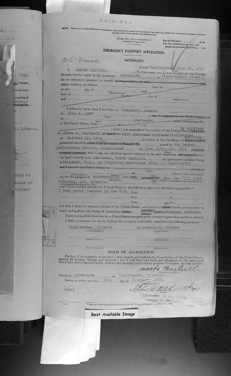 В заявке на аварийный паспорт (emergency passport application) написано, что Марфа Хартселл родилась 4 июля 1898 года в Оренбурге.