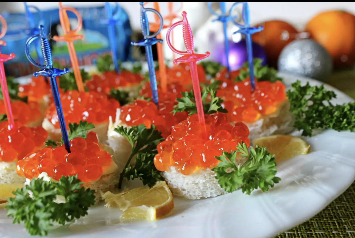 Сильный, уверенный, решительный, независимый, энергичный… Именно таким перед нами предстает символ Нового 2022 года – Черный (Голубой) Водяной Тигр. Как видим, это животное довольно своенравное, поэтому нужно постараться угодить ему при обдумывании новогоднего меню. Особенности празднования Тигры привязаны к месту, поэтому они точно оценят празднование в узком семейном кругу, уютную домашнюю атмосферу, красивое, но без излишеств оформление стола, простые, но разнообразные блюда. Тигр – хищник, поэтому в новогоднем меню на 2022 год должны преобладать рецепты мясных блюд. Но не откажется величественное животное и от семейных традиций – классических новогодних закусок, салатов. Так как хищник все свое время проводит в окружении природы, он не будет против и растительных блюд. А вот алкоголь, как и шипучие напитки, хозяин года не приветствует, поэтому усердствовать не стоит. Закуски Канапе с красной икрой, помидорами черри, красной рыбой или огурцом никогда не будут лишними. Не стоит отка