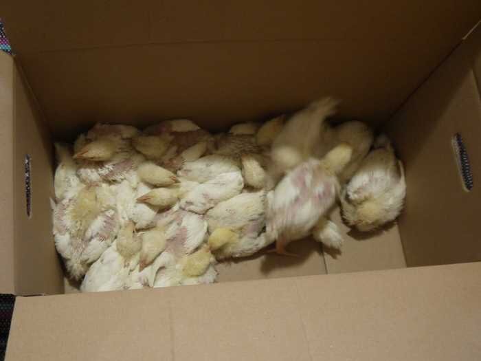 На ночь птиц нужно заносить в сарай, укладывая их в коробку. Пока цыплята маленькие, они очень плохо переносят холод. Необходимо над коробкой повесить лампу, тепло от которой согреет бройлеров.
