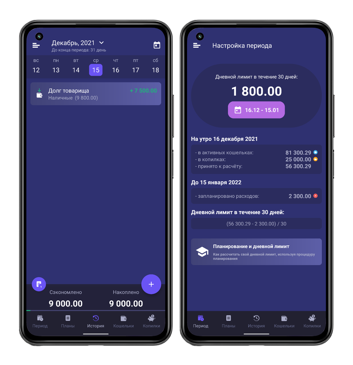 Возьмем для примера ситуацию, когда ваш дневной лимит составляет 1500 рублей. Представьте теперь, что в какой-то день спланированного периода ваш товарищ отдаёт вам долг, про который вы давно забыли и уже не рассчитывали на его возвращение. 7500 рублей - неплохая сумма, и вы могли бы спрятать её в копилку или в неактивный кошелёк, но вместо этого вы можете равномерно распределить её по всему спланированному периоду, увеличив свой дневной лимит. Всё что для этого нужно сделать - изменить дату начала спланированного периода на день, следующий за днём, когда вы получили долг обратно. В примере на скриншотах дата начала периода изменяется с 15 на 16 декабря: