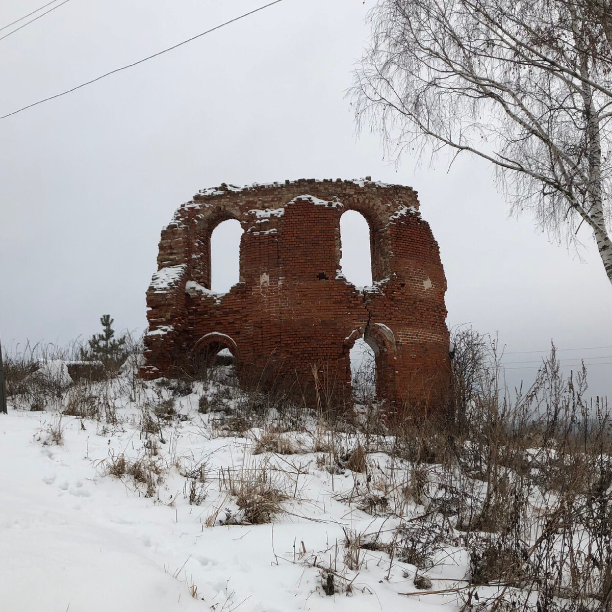 На живописном высоком берегу реки Оки в Тульской области стоит довольно крупное село Большое Хорошово. Раньше тут текла жизнь круглый год, сейчас, по-видимому, люди приезжают в село только летом. Когда я приехал зимой в Большое Хорошово, мне не удалось встретить никаких следов жизни: ни людей, ни машин, ни света в окнах не было. Только огромный заяц, выскочивший очень резко из-за здания, на секунду заставил уйти мое сердце в пятки. В село я приехал, чтобы сфотографировать старый храм Иоанна Дамаскина (начало XX века), который доживает свои последние годы. Церковь была выстроена на средства купца Ионкина. Архитектор храма неизвестен, как и точный год постройки. Храм стоит в самом центре села на возвышении. От него сейчас осталась всего одна стена. А еще 10 лет назад церковь была в куда лучшем состоянии: После обильных дождей в 2011 году, купол церкви и стены рухнули. С тех пор и стоит в трещинах всего одна стена некогда огромной церкви. Мне удалось найти несколько старых снимков хр