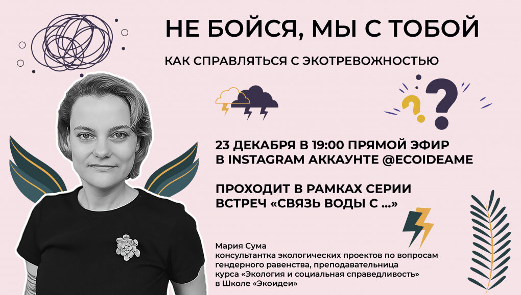 Онлайн-проект Ecoidea.me организовывает цикл прямых эфиров «Связь воды с ….». Предлагаем обсудить как вода связана с органическим сельским хозяйством, личной гигиеной и отходами во время празднования Нового года. Вторая встреча состоится 23 декабря 2021 года в 19.00 в instagram аккаунте. Экспертка второй встречи – Мария Сума, консультантка экологических проектов по вопросам гендерного равенства, преподавательница курса «Экология и социальная справедливость» в Школе «Экоидеи». В преддверии Нового года, мы вспоминаем прошлое и загадываем желания на следующий год. И это очень тревожное время, в том числе из-за тех климатических и экологических катастроф, которые предвещают ученые. Предлагаем поговорить, как справляться с экотревожностью и не опускать руки, как сохранить себя и свое здоровье, чтобы продолжать делать то, что считаешь важным, как не перестать верить, что мои действия имеют смысл. Мария Сума сталкивалась с этим чувством, поэтому хочет поделиться с вами своими открытиями Вы мо