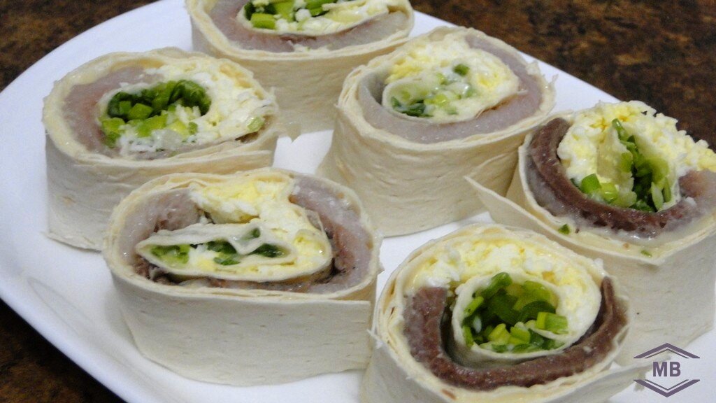 Холодная закуска — рулет из лаваша с сельдью — шикарно дополнит любое застолье. Интересное сочетание продуктов и отменный вкус закуски оценят и гости, и семья. Ингредиенты: 2 яйца, 5 веточек зелёного лука перьями, 200 гр филе селёдки, 200 гр плавленного сыра, 1 прямоугольный лист лаваша. Процесс приготовления: Лист лаваша промазываем плавленным сыром. Равномерным слоем с одного края лаваша распределяем нарезанный зелёный лук. За ним слоем выкладываем натёртые на крупной тёрке отварные яйца. Далее — слегка отбитое филе сельди. Сворачиваем лист лаваша в рулет со стороны лука. Нарезаем на кусочки толщиной 3-4 сантиметра. Переворачиваем заготовки и выкладываем на сервировочное блюдо. Закуска «рулет из лаваша с сельдью» готова. Приятного аппетита и весёлых праздников!
