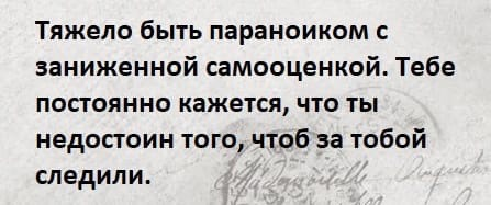 Немного мыслей о том, когда вам кажется, что за вами следят. Не в смысле поджидают у подъезда (это другое, и занимаются подобным специально обученные люди), а ходят по вашим страницам, отслеживают комментарии. ..Не обольщайтесь особенно, это не от того, что вы яркая пташка, оч интересный человек, вас любят или ещё что в этом духе, вовсе нет. Если вы будете помнить о том, что каждого человека прежде всего интересует своя шкурка (и вы не исключение, не надо тут изображать оскорбленную невинность), то вы поймёте, почему за вами следят на самом деле. Каждый из нас это так или иначе хоть раз в жизни делал. Задумайтесь, что вас толкнуло? Прям вот серьёзно - интерес к человеку? Ага-да. Верю. Копайте глубже. За вами следят, чтоб покормить своё ЧСВ. Все. Никому вы не интересны и не нужны. Каждому интересна своя самооценка и жизнь в первую очередь. Так что, к вам на страницу (или ещё как-то следят) приходят или чтоб поржать и за счёт этого полирнуть себе корону, убедиться, что человек по сравнен