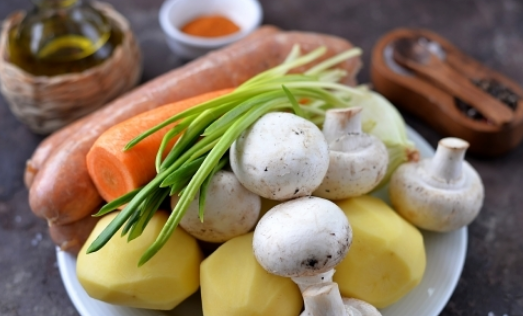 Пошаговый рецепт с фото Ингредиенты Купаты куриные - 600 г Картофель - 500 г Морковь - 1 шт. Лук репчатый - 40 г Шампиньоны - 200 г Приправа для овощей - 1 ст.л. Соль - по вкусу Перец ч.м. - по вкусу Масло постное - 2 ст.л. Черемша (чеснок) - по вкусу Рецепт После длинного трудового дня, если не хочется долго стоять у плиты, а семью нужно накормить сытным и калорийным ужином, можно запечь купаты с овощами в духовке в рукаве. Рецепт очень простой, подготовка может занять меньше 10 минут. Вам останется только запастись терпением и дождаться приготовления вкуснейшего ужина. Подготовьте продукты по списку. Лук, морковь и картофель почистите, помойте вместе с черемшой под проточной водой. Грибы зачистите жесткой кухонной губкой. В глубокую миску сложите крупно нарезанный картофель, лук и морковь. Добавьте нарезанные шампиньоны и черемшу (или чеснок). Всыпьте приправу для овощей, соль и перец по вкусу, влейте постное масло. Перемешайте все тщательно, чтобы все овощи были хорошо покрыты масло