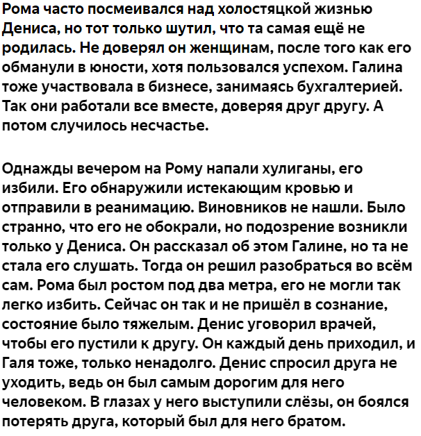 Роман с Денисом были больше, чем друзья. Это было нечто вроде кровного родства. В школе они сидели за одной партой, а потом весте гуляли во дворе все 10 лет. А потом специально поступили в один универ, чтобы не расставаться. Окончив ВУЗ, создали свою автомастерскую. Бизнес шел хорошо. Рома женился на Гале, своей университетской любви. Денис пока не встретил свою единственную. Правда, что-то в Роминой жене Дениса смущало. Но он не вмешивался. Дескать: «не мое дело». У Ромы и Гали не было детей, хоть они неоднократно пытались.