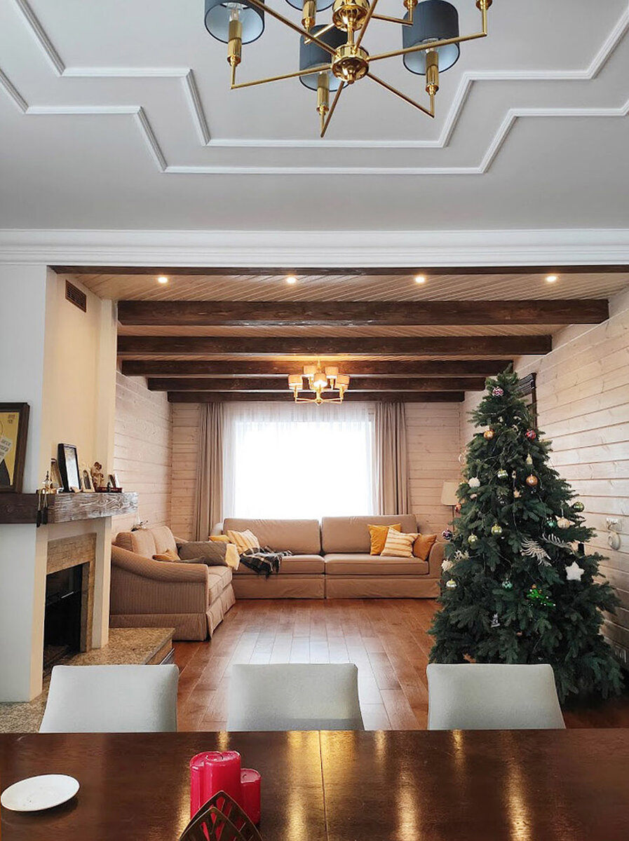 “Место проживания” камина ─ граница между обеденной зоной и простой деревянной гостиной молочного цвета на вагонке стен и потолка “в косую полоску”; с мягким точечным освещением и классическими восьмирожковыми латунными люстрам