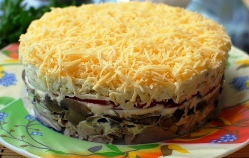 Тәрилкәгә үрҙә һаналып үтелгән аҙыҡты сиратлап ҡатлап һалабыҙ: тауыҡ ите (өҫтөнә майонез), һуғанлы бәшмәк (майонез), помидор (майонез). Салаттың өҫтөнә күп итеп сыр һибәбеҙ.