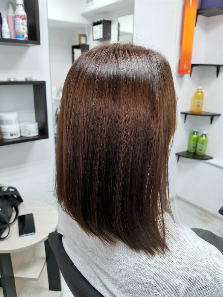 И снова не перестаю писать о красителе Picasso. В этом красителе очень много красивых теплых оттенков и самым востребованным является 7.77 коричневый, он так и называется коричневый. Здесь мы работали именно коричневым оттенком 7.77. Сначала нанесли на корни с 5,5% оксидом. Седины здесь не было, но нам необходимо было поднять уровень глубины тона на 2. Я думаю все у нас получилось. Затем было тонирование по полотну на 3% оксиде, 1:2. Эта краска действительно создает такой блеск на волосах и мягкость волос. Но я всегда рекомендую мастерам делать вытяжку цвета, для того, чтоб видеть какой получится оттенок. Так как например 7.35 оттенок какао в палитре представлен как такой золотистый шоколад, а на волосах получается красноватым шоколадом. Именно поэтому полезна вытяжка цвета. Напишите на каких красителях работаете вы? Как давно? И почему?