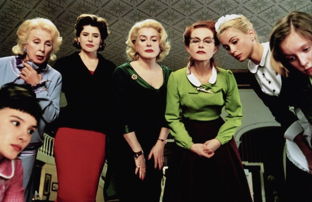 Хотя в фильме есть детективная линия и поиски убийцы — фильм держится отнюдь не на лихо закрученном сценарии, виновника происходящих событий выявить достаточно просто и в самом начале фильма. Весь фильм — это настоящий бенефис 8 блестящих актрис. Уже одно то, что Озон смог собрать в своем фильме практически всех лучших актрис Франции, говорит о многом. Все они разные, принадлежат к разным поколениям, но всех их отличает одно — стопроцентное попадание в образ. Определить кто лучше, кто хуже практически невозможно, на мой взгляд, из общего ряда лишь немного выпадает Фермин Ричард, но с другой стороны её персонаж, мадам Шанель, далеко не самый интересный.