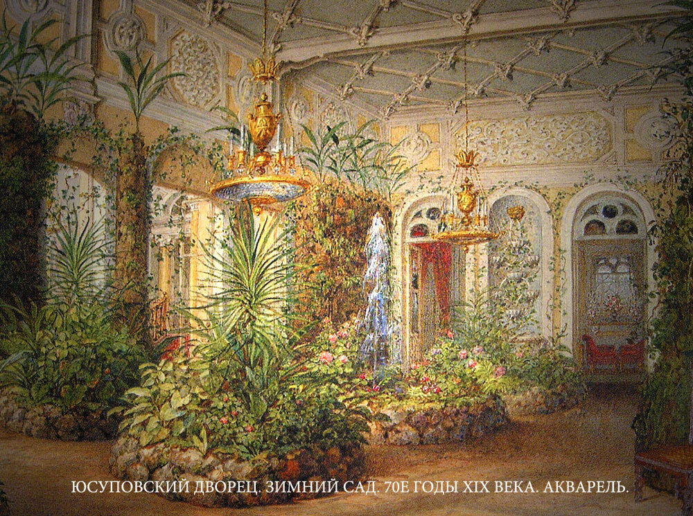 В России зимние сады появились в XVIII в. Во многом их происхождение связано с проникновением западноевропейских традиций в дворцовое строительство, но были к тому и собственные предпосылки. Еще в XVII в. в Россию начали проникать привозные растения, часто южного происхождения, поэтому необходимо было как-то их сохранять в суровых климатических условиях. Желание иметь сад или его подобие в непосредственной близости к жилым покоям порой приводило к необычным решениям. В известном сочинении «Домашний быт русских царей в XVI и XVII столетиях» историк И.Е. Забелин приводит описания некоторых интерьеров второй половины XVII в.: «В комнате царицы Натальи Кирилловны находился между прочим: “Рай — в нем поставлено древо расцвечено разными краски, на древе сидит ангел мечем; по сторонам того древа стоят люди и всякие звери”. Станок, в котором все это помещалось, был убран зеркалами с целью придать изображениям еще больше виду и игры. У царевича Алексея Алексеевича в этом же роде был “Сад с груш