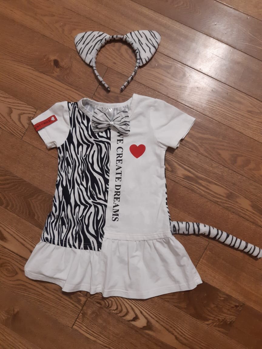 Недавно в саду объявили тему Нового года – звери. Звери настоящие, а не фантазийные. По желанию родителей ребёнка можно привести в образе лисички или медвежонка. В моём детстве девочки обычно были снежинками, а мальчики зайчиками. К такому повороту я была не готова. Я начала искать и приглядеться к мордочкам из искусственного меха. Одна не похожа на заявленного зверя, у другой качество подкачало, да и найти необходимый размер ещё тот квест. Я уже решила, что этот Новый год дочка пропустит и будет просто девочкой. Тут я вспомнила про наше платье из коллекции «Зебра». Я решила попробовать подобрать аксессуары созвучные с названием коллекции для дополнения образа. Платье "Зебра" - 1252 руб. по ссылке ТУТ Мне несказанно повезло, я их нашла. В комплект входит ободок с ушами, бантик-бабочка и хвост. В результате у меня получилась прекрасная зебра на новый год. А главное этого зверя редко кто приводит под новогоднюю ёлочку. Подобный образ можно составить из других элементов коллекции, но у